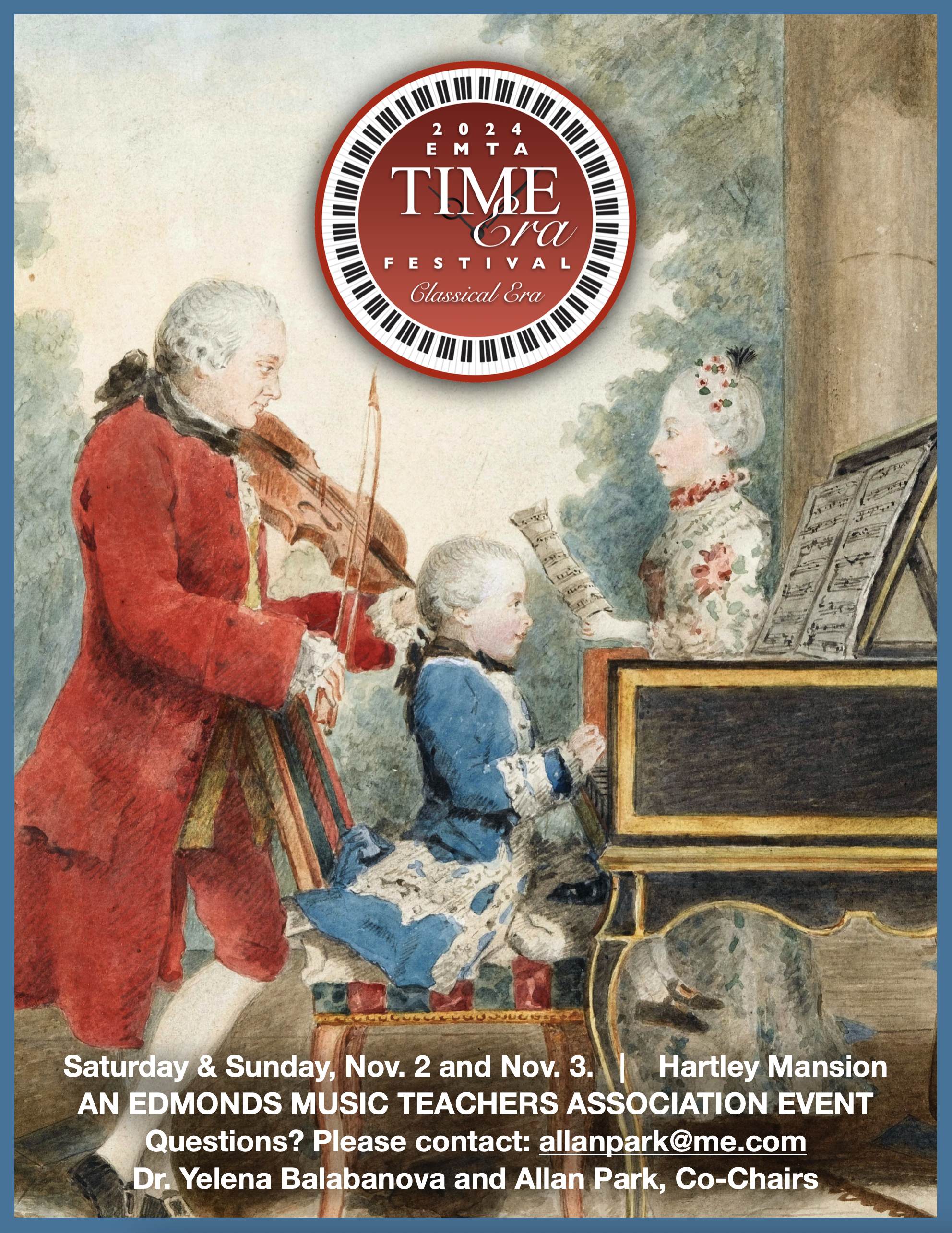 The purpose of Time Era Festival is to encourage the exploration of piano music by the chosen era of music. This year’s festival will explore the Classical period (Mozart, Haydn, Clementi, Beethoven, etc.).